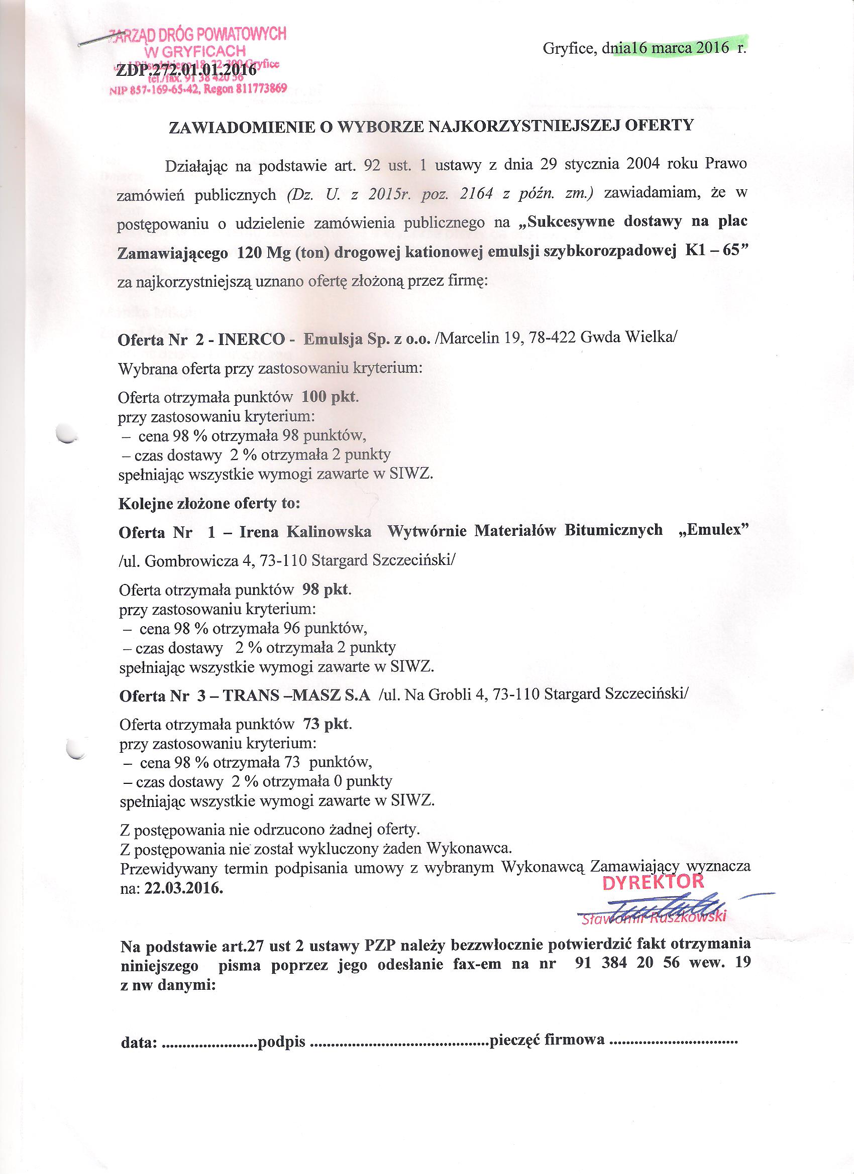 Zawiadomienie o wyborze najkorzystniejszej oferty na dostawę 120 Mg (ton) drogowej kationowej emulsji K1 - 65