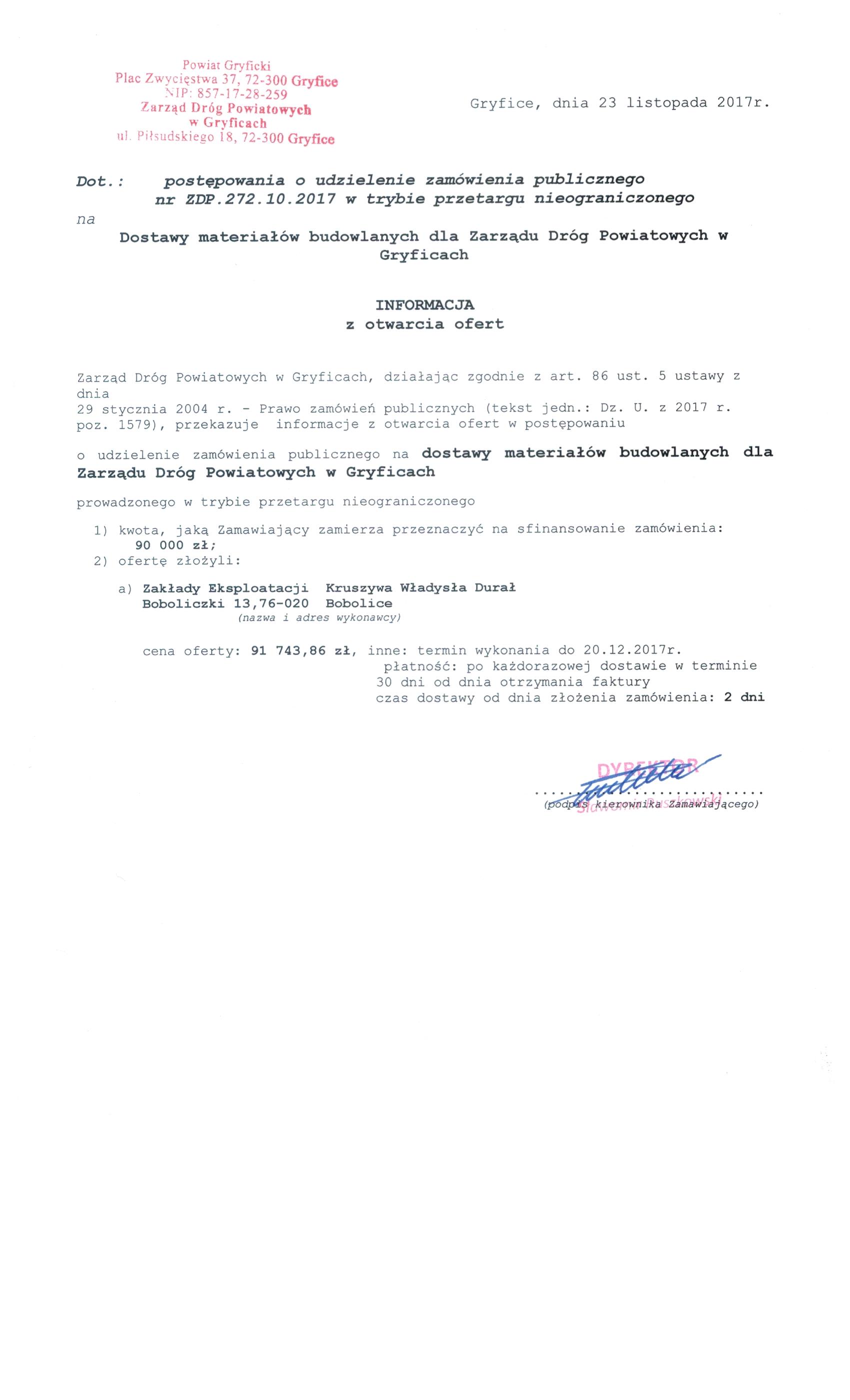 Ogłoszenie na dostawy materiałów budowlanych dla ZDP Gryfice