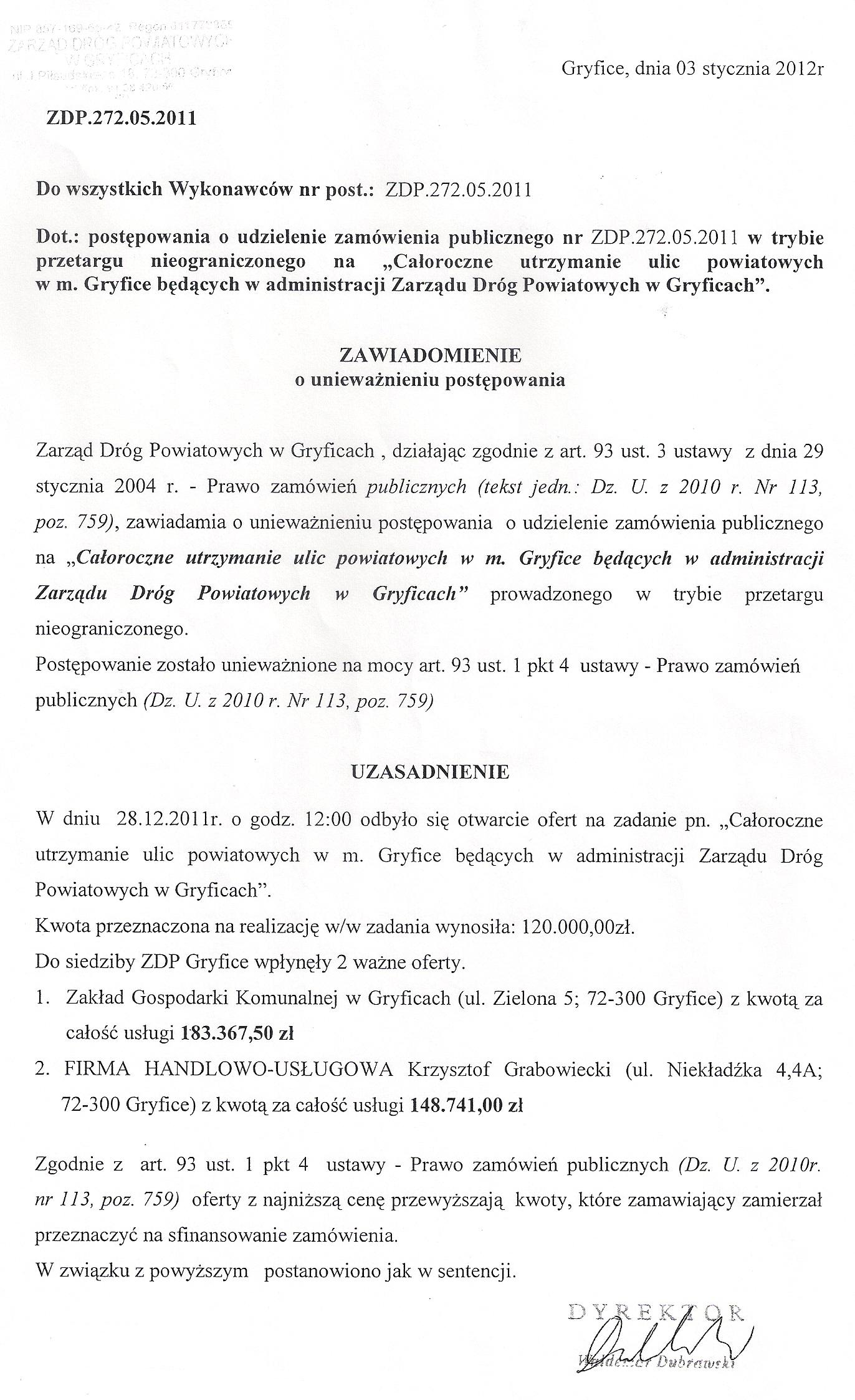 Unieważnienie postępowania na całoroczne utrzymanie ulic powiatowych w m. Grifice będących w administracji Zarządu Dróg Powiatowych w Gryficach