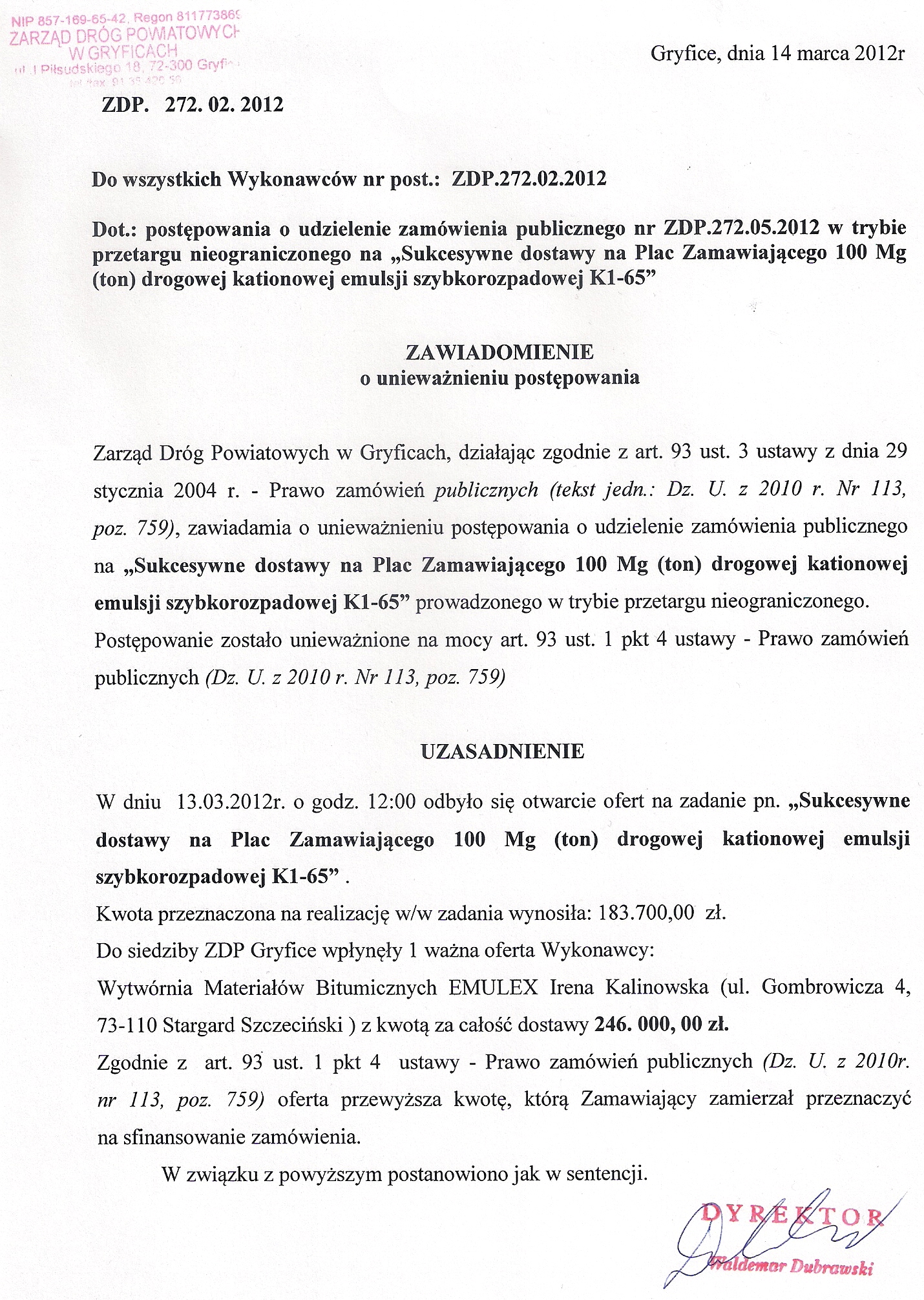 Unieważnienie przetargu na dostawę emulsji
