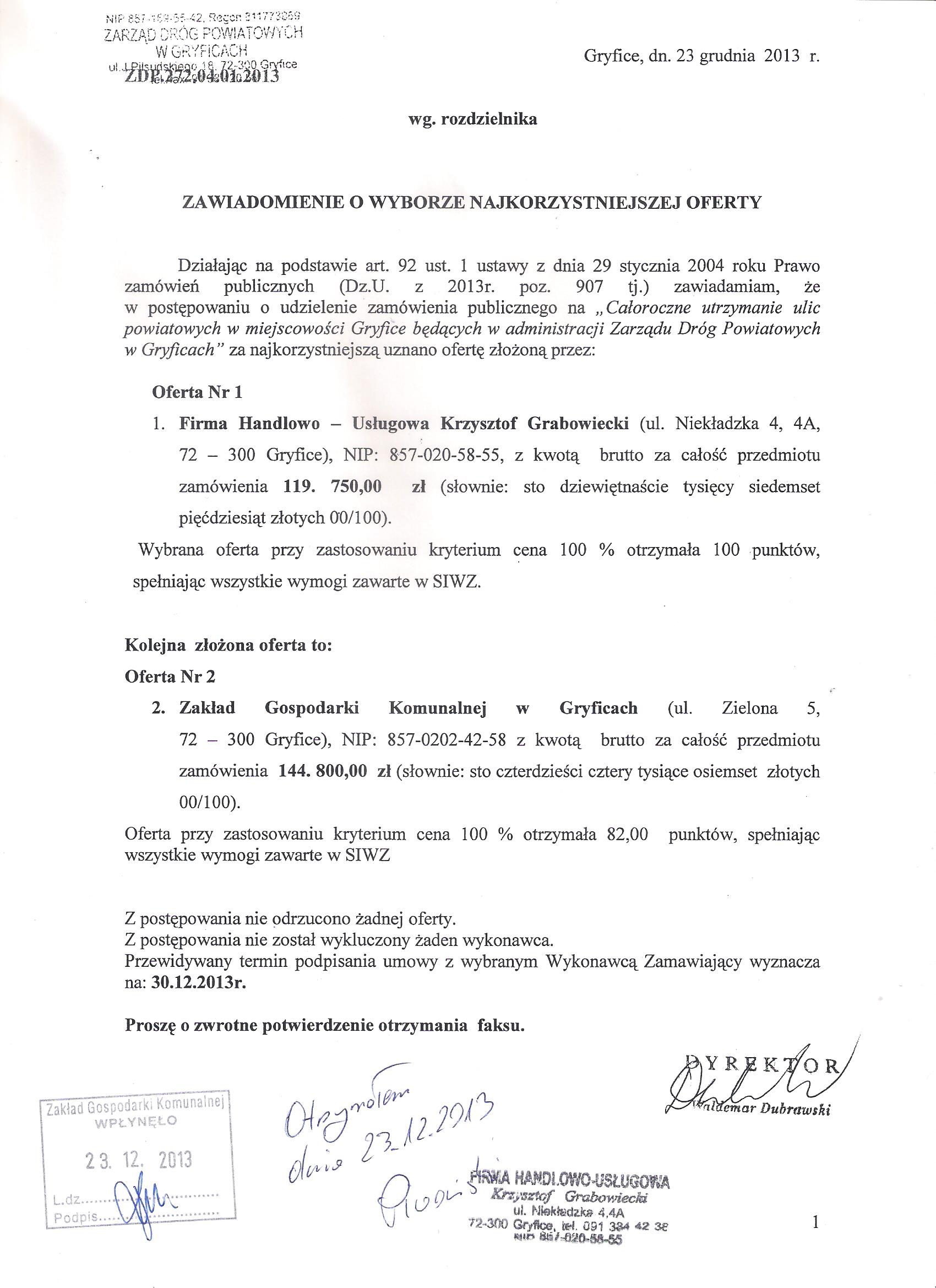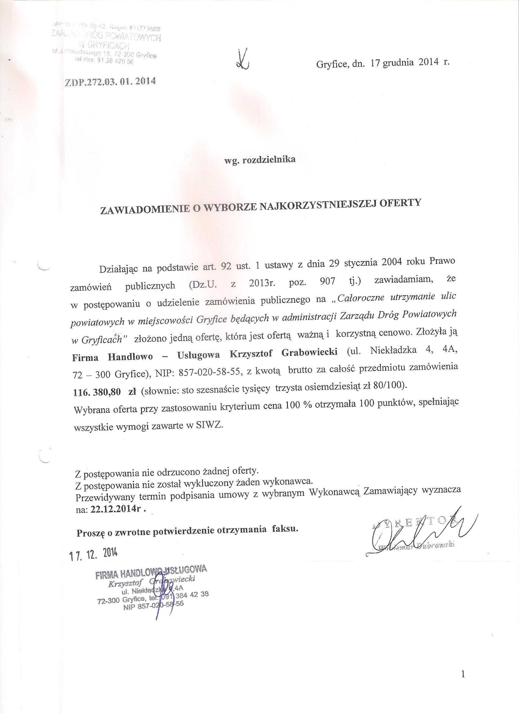 Zawiadomienie o wyborze najkorzystniejszej oferty na całoroczne utrzymanie ulic powiatowych w m. Gryfice 2014