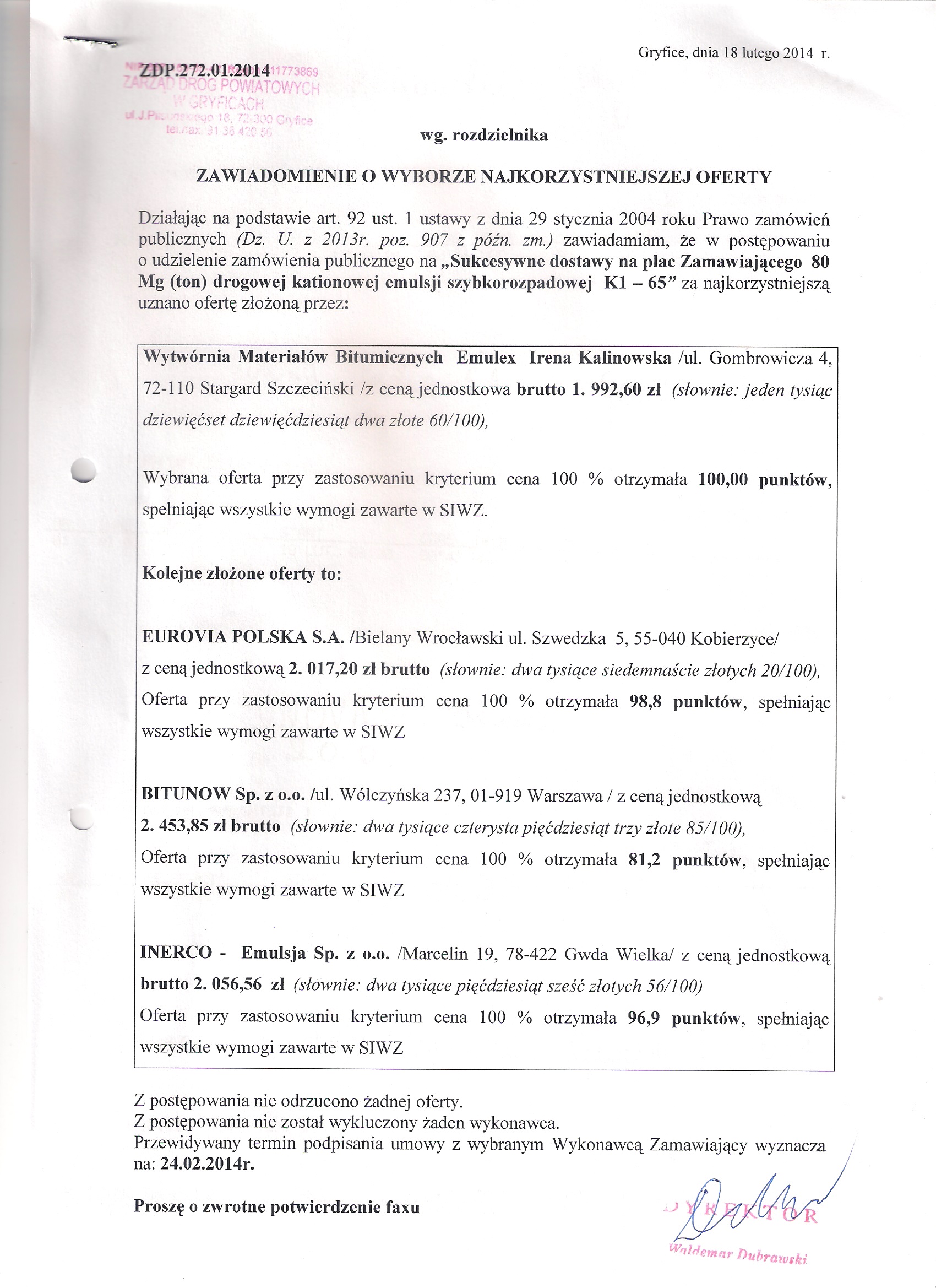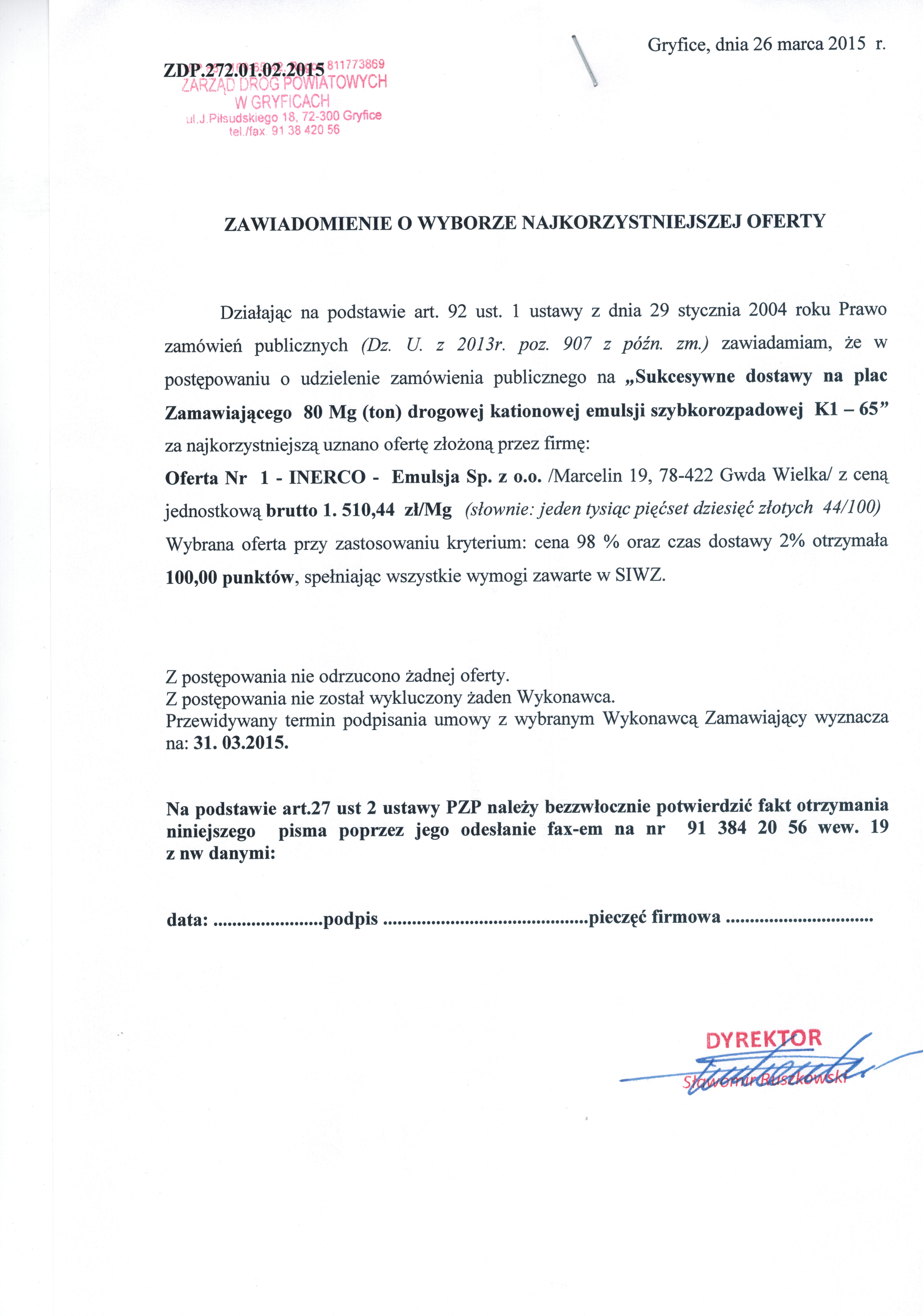 Zawiadomienie o wyborze najkorzystniejszej oferty na dostawę emulsji 2015
