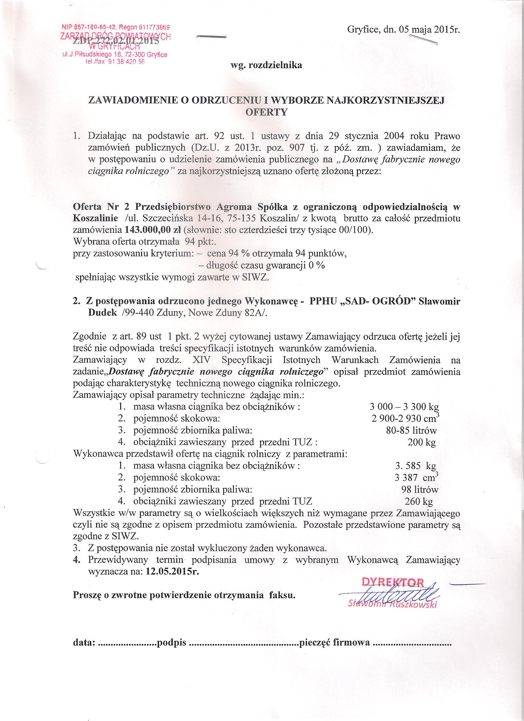 Zawiadomienie o odrzuceniu i wyborze najkorzystniejszej oferty na dostawę fabrycznie nowego ciągnika rolniczego